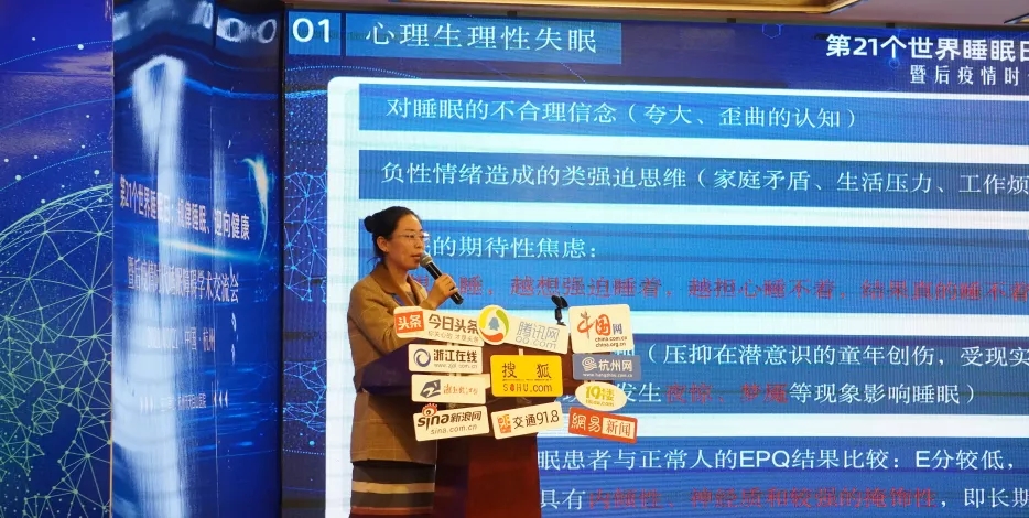 杭州市第七人民医院心身科医疗组组长——任婉文正在进行题为《焦虑患者的睡眠非药物干预》的学术分享。