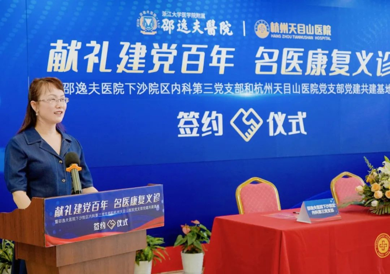 仪式上,浙江大学医学院附属邵逸夫医院下沙院区内科第三党支部书记沈水珍在致辞中表示,在此后的合作中,双方党建互促互进的政治优势将更好地转化为发展优势,康复义诊活动也会给更多的患者带来便利和健康,同时邵逸夫医院内科第三党支部将提供连续性、可及性健康服务,对天目山医院及其周围基层百姓在医疗过程中遇到的危重、疑难情况,如限于技术、设备等情况限制,尽可能给予及时会诊支援,并优先安排床位接收转诊。双方合作共赢,共同在新时代的长征路上取得新成效,新进展,新胜利。