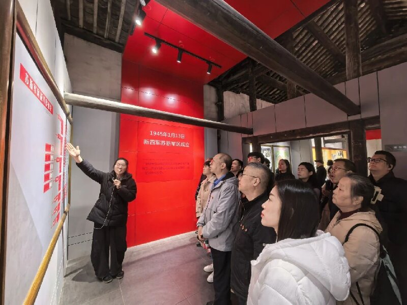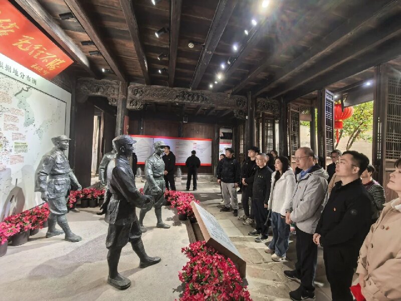 活动首站,全体党员及离退休党员代表列队前往江南红村,集体参观了新四军苏浙军区纪念馆。在庄严肃穆的氛围中,双方党支部举行了敬献花篮、缅怀先烈的仪式。面对鲜红党旗,党员干部们重温入党誓词,再次铭记对党的忠诚与承诺。随后,在专业讲解员的引导下,大家认真观看历史展览,通过珍贵文物、史料图片和生动讲述,深刻感悟新四军将士在艰苦岁月中信念如磐、英勇奋斗的革命精神,进一步增强了党性修养与历史使命感。